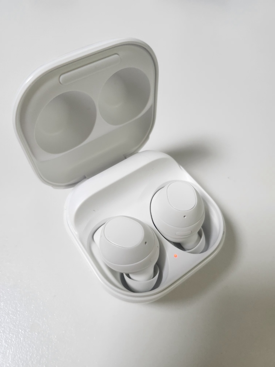 버즈 FE는 윙팁 디자인 덕분에 귀에 착 감기는 느낌이 좋습니다. 처음에는 윙팁이 조금 낯설었지만, 몇 번 착용해 보니 오히려 안정감이 생겨서 출퇴근길 지하철 안이나 조깅할 때도 전혀 빠질 걱정이 없었습니다. 장시간 착용해도 귀가 아프지 않았고, 이어팁 사이즈를 조절하니 밀착감도 훨씬 좋아졌습니다.